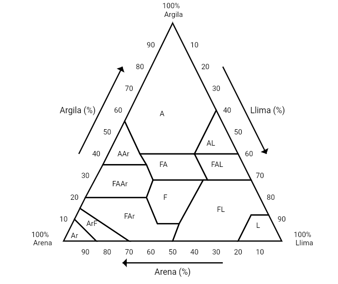 a. Indicar el porcentaje de Arena, Lima y Arcilla (la suma siempre debe ser igual a 100) y, a partir de estos, se calcula con el triángulo de las texturas como muestra la siguiente figura, la clase de textura.
